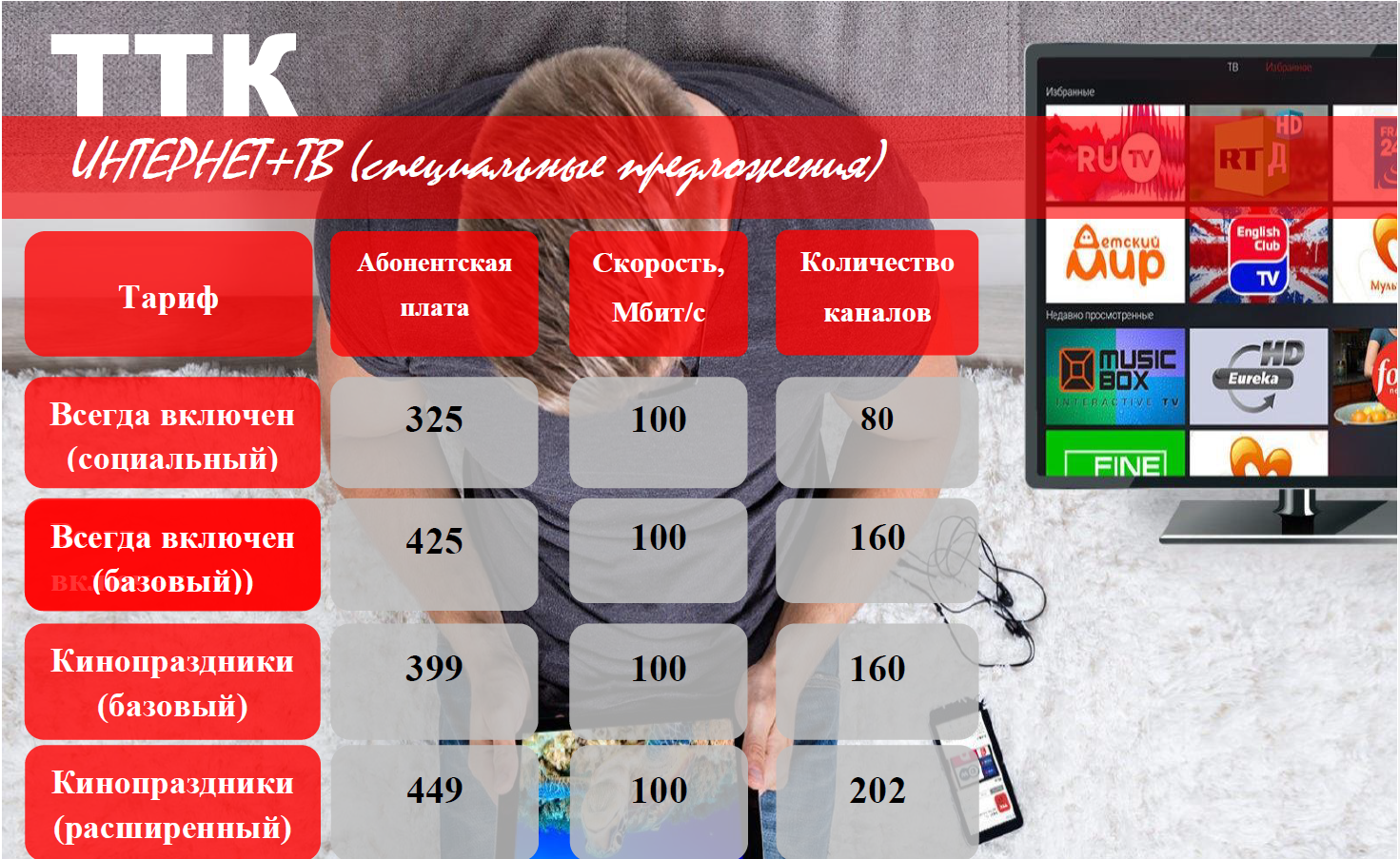 1. Тарифный план "формула лайт" включает в себя 100мб/сек круглосуточной скорости , 158 каналов + мобильная связь (1000 минут звонков на любые номера + 5гб мобильного интернета). Абонентская плата с 1-го по 3-й месяц составляет 420 рублей, начиная с 4-го месяца – 620 рублей.